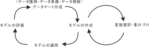 これらのワークフローをスパイラル上にぐるぐる回していくことで、より良いモデルへと近づいて行きます。もちろん、言うまでもなく、最初のデータマートの作成の前には、問題の定義がなされているべきであり、問題に関する基本的な理解が必要です。そして、データマートを作成する段階で基本的な統計解析がなされ、モデルの作成の段階で初期的なマップが可視化されることなどを通して、データの理解が徐々に深まっていきます。